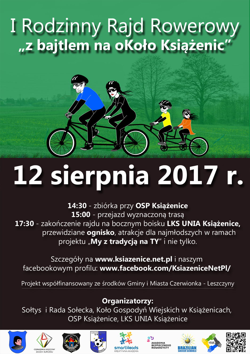 Sołtys wraz z Radą Sołecką, Kołem Gospodyń Wiejskich, OSP Książenice i Unią Książenice zapraszają do wspólnej zabawy w rajdzie rowerowym pod hasłem „z bajtlem na oKoło Książenic”.Rajd odbędzie się w sobotę 12 sierpnia 2017. Zbiórka zainteresowanych przewidziana jest na godz. 14:30 pod OSP Książenice. Uczestnikom rozdane zostaną foldery z wyznaczoną trasą i szczegółami. Start o godz. 15:00. Zakończenie wspólnego pedałowania planowane jest ok. godz. 17:30, na bocznym boisku Unii Książenice. Godzina jest oczywiście umowna, nie każdy musi jechać wspólnym tempem, nie każdy musi przejechać całą trasę.